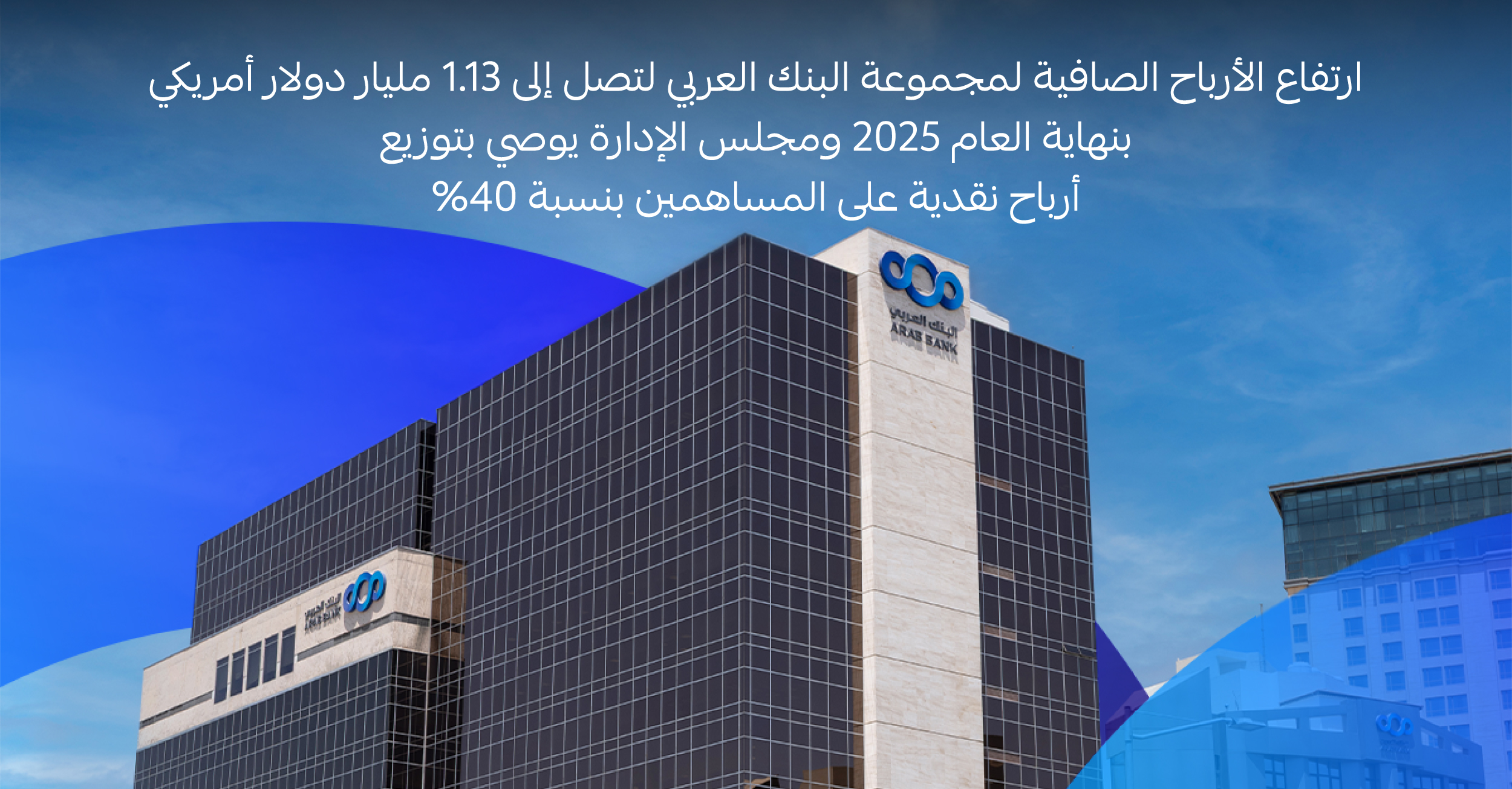 نبذة عامة يوافق ويوصي مجلس الإدارة للهيئة العامة للبنك بنسبة توزيع الأرباح لمساهمي البنك العربي ش م ع،... البيانات المالية البيانات المالية الرئيسة سندات الدين أعلن البنك العربي عن نجاح عملية الاكتتاب في أسناد القرض الدائمة ضمن الشريحة الأولى الإضافية لرأس... الحوكمة والامتثال تقدّم العلاقة بين البنك العربي ومجلس إدارته من جهة والمساهمين من جهة أُخرى إطار عمل عام... الأخبار والتحديثات البنك العربي الراعي الحصري للنسخة الأولى من مهرجان "بالعربي" في متحف الأطفال معلومات الاتصال اختر من بين الخيارات أدناه لتلقي الأخبار والمعلومات المالية الأخرى عن طريق البريد الإلكتروني.اختر من بين... -